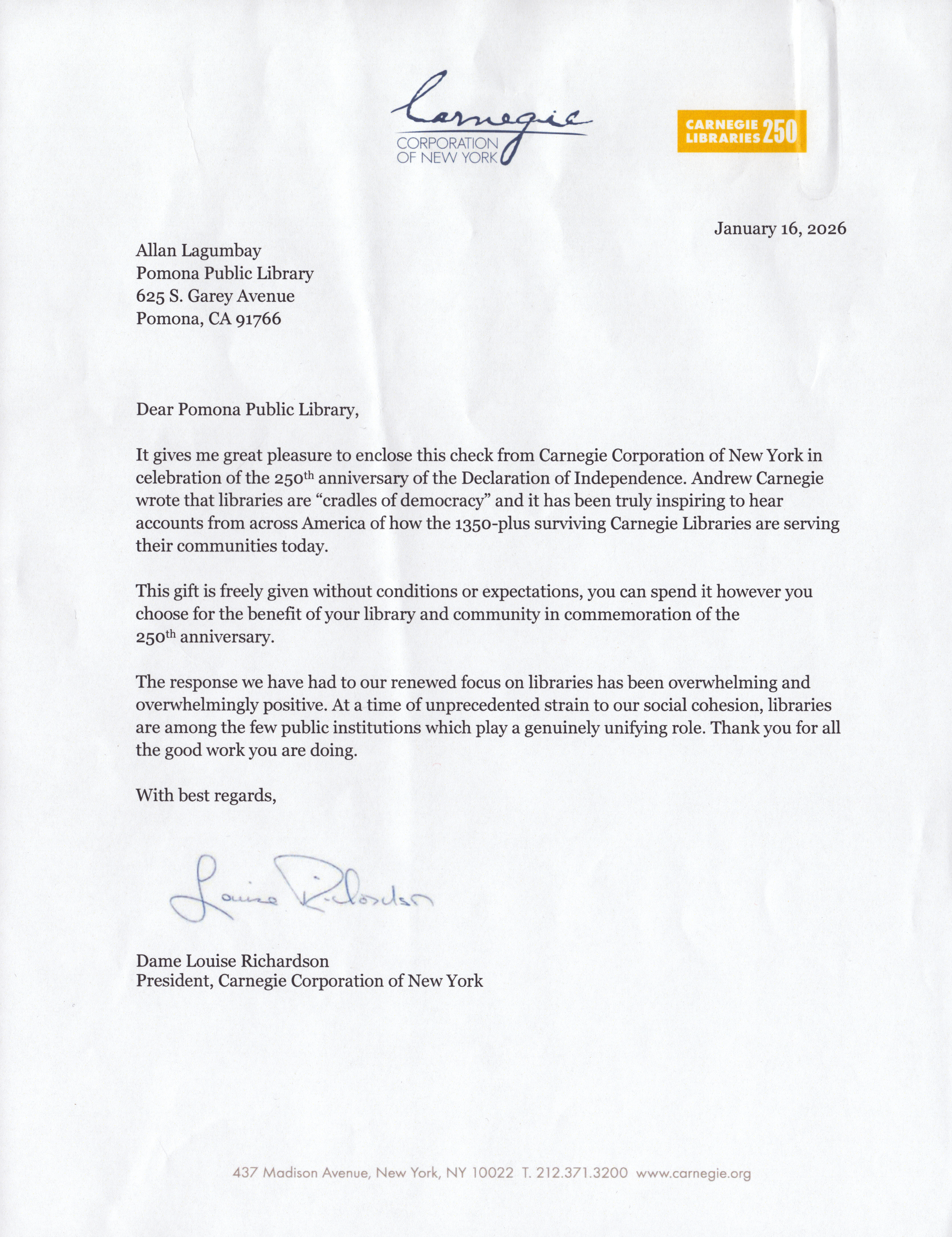 RESOLUTION NO. 2026-36 - A Resolution of the City Council of the City of the City of Pomona, California, Authorizing the Acceptance of $10,000 Donation from the Carnegie corporation of New York in celebration of the 250th anniversary of the declaration of independence, for the benefit of the Pomona public library and amending the FY 2025-26 operating budget by increasing revenue estimates and Appropriating the Funds for Expenditure